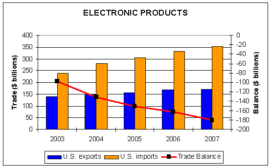 - The U.S. merchandise trade deficit in electronic products continued to rise for the sixth consecutive year in 2007. This was due in part to continued foreign outsourcing of electronics production by U.S. companies.